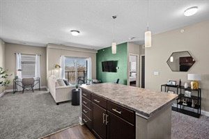 Unwind in a light-filled space with a comfy sofa, 55” Smart TV, and large sliding door to the patio. Take in pool and clubhouse views — or enjoy Iowa’s famous sunsets with a drink in hand.